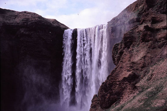 スコゥガフォス2 Skogafoss アイスランドで最も印象に残る滝 落差60mの滝。 断崖には多数のカモメが巣を作っています。 スコゥガフォスの滝壺の中には 宝物が隠されているという伝説があるそうです。